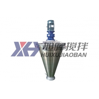 錐形螺帶混合機由傳動機構、錐形筒、外層螺帶攪拌器、內層反向螺桿攪拌器和出料閥組成。物料在外層螺帶攪拌器的作用下沿軸向盤旋、提升,內層反向螺桿攪拌器將物料沿軸向盤旋下推,完成快速混合動作。根據實際需求,螺帶可選多種設計形式。